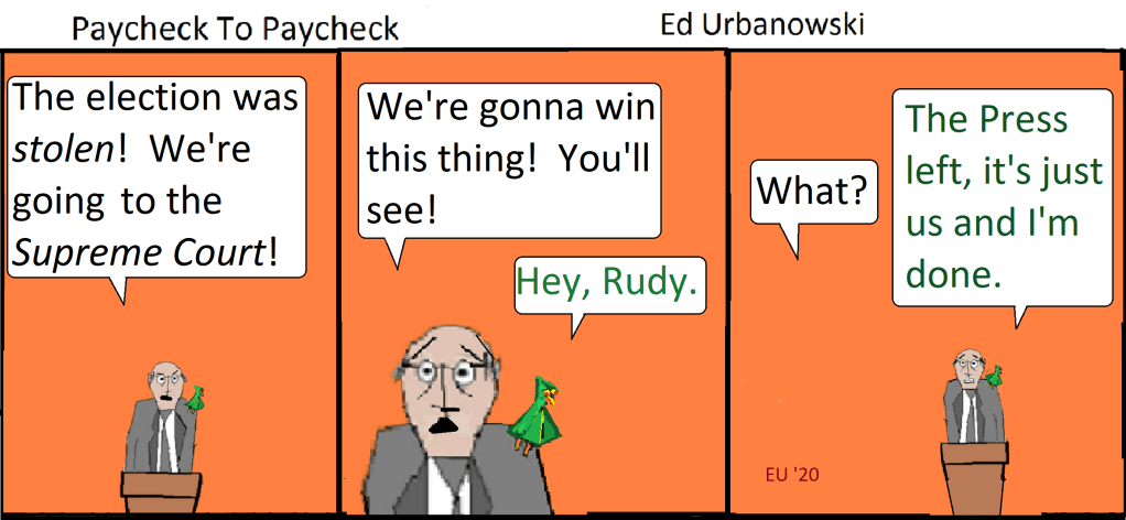 Rudy’s last gasp! November 7, 2020 ~ ed1212 Share this: Click to share on X (Opens in new window) X Click to share on Facebook (Opens in new window) Facebook Like Loading... Related Published by ed1212 Self-published author, poet, cartoonist and dog lover. I respect and encourage differing opinions, so long as they're well-informed and based in fact. View all posts by ed1212