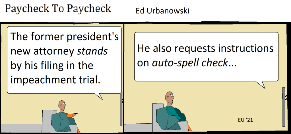 Between impeachments February 4, 2021 ~ ed1212 Share this: Click to share on X (Opens in new window) X Click to share on Facebook (Opens in new window) Facebook Like Loading... Related Published by ed1212 Self-published author, poet, cartoonist and dog lover. I respect and encourage differing opinions, so long as they're well-informed and based in fact. View all posts by ed1212