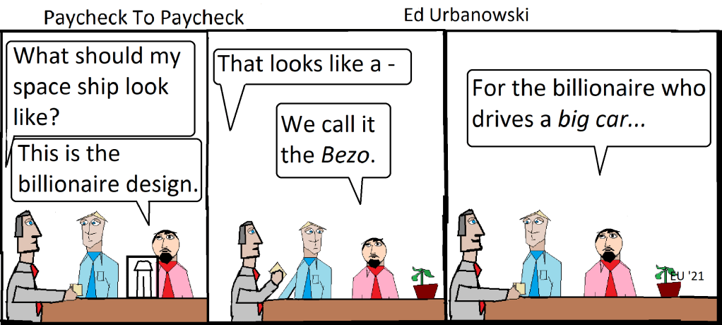 CEOs in space… July 20, 2021 ~ ed1212 Share this: Click to share on X (Opens in new window) X Click to share on Facebook (Opens in new window) Facebook Like Loading... Related Published by ed1212 Self-published author, poet, cartoonist and dog lover. I respect and encourage differing opinions, so long as they're well-informed and based in fact. View all posts by ed1212